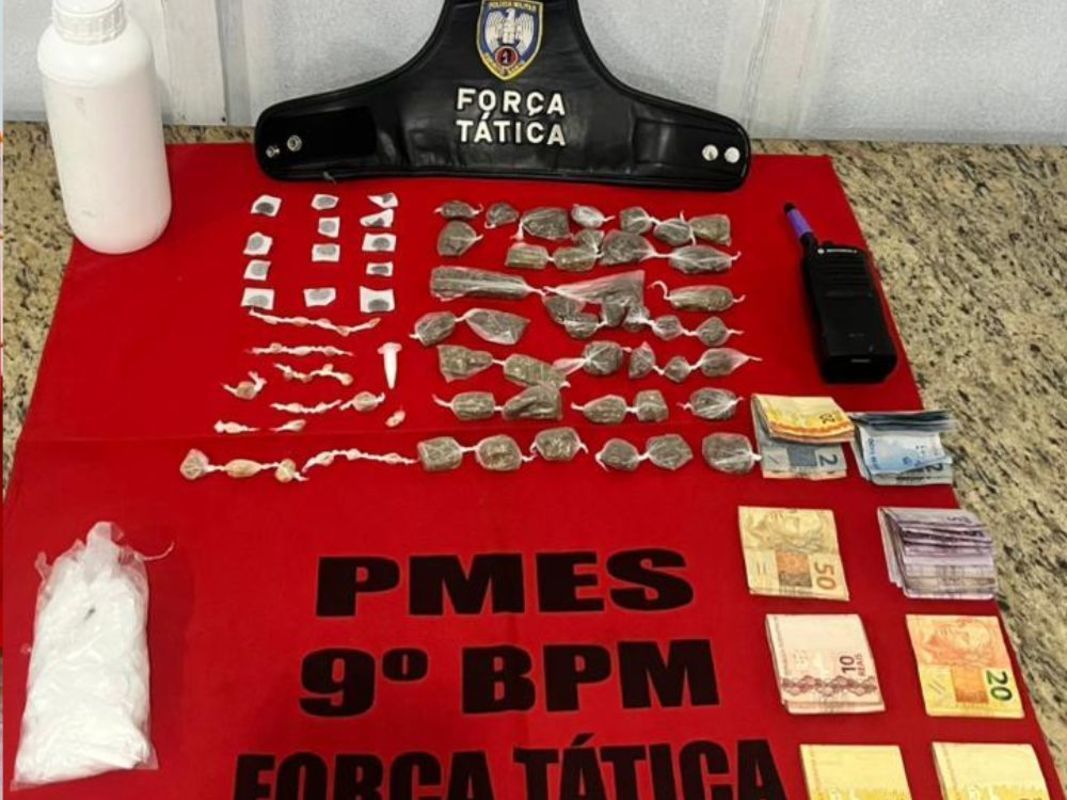 Durante as diligências, os policiais encontraram substâncias ilícitas e materiais usados na atividade criminosa. Ao todo, foram apreendidas 41 buchas de maconha, 13 packs - um tipo de haxixe de alta qualidade, mais caro em comparação à maconha-, um pino de cocaína, 25 pedras de crack, um litro de loló, além de um rádio transmissor e R$ 747 em dinheiro.